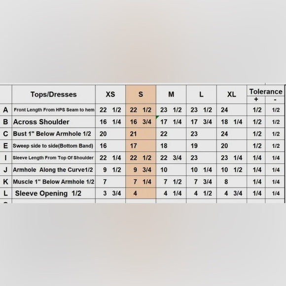 Bust (1/2): XS-20", S-21", M-22", L-23", XL-24"